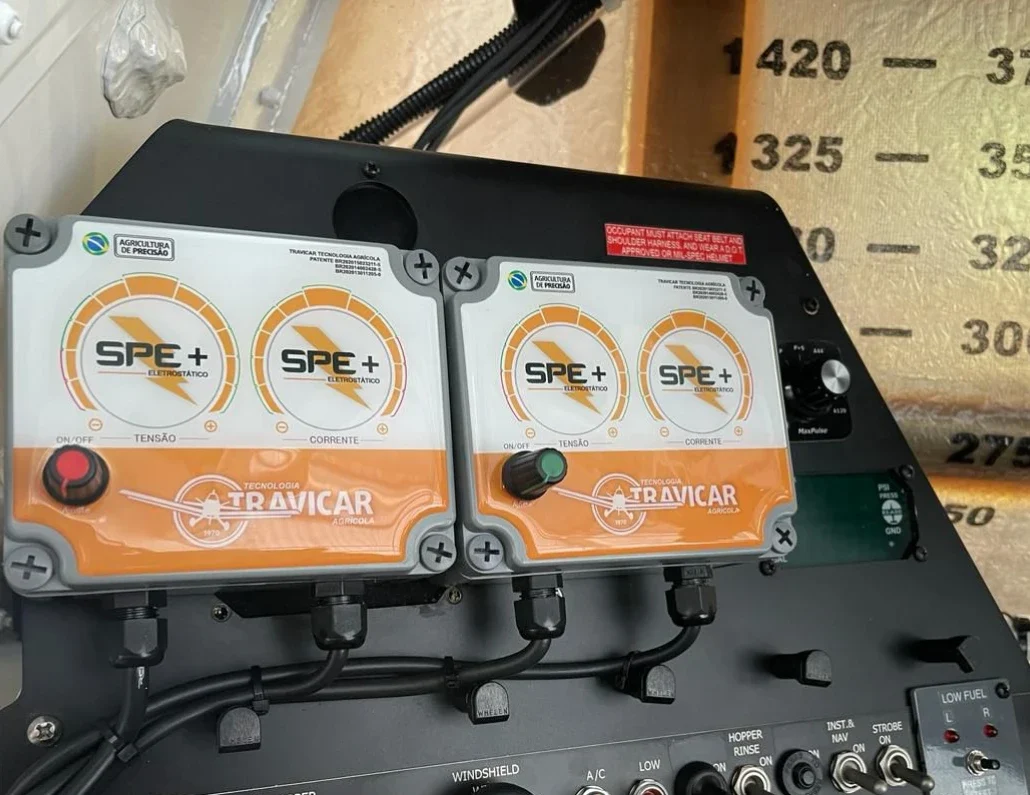 Aumente a eficiência da sua pulverização aérea com o SPE Aéreo Eletrostático Travicar. O sistema gera um campo eletrostático que potencializa a deposição das gotas na cultura, reduzindo a deriva e aumentando a aderência do produto às folhas. O resultado? Menos desperdício e máxima cobertura em cada aplicação.